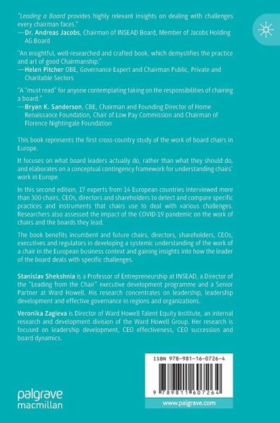 Chapter 1: Work of a Chair in Europe: Context, Content and Evolution.- Chapter 2: The United Kingdom: Indirect Leadership.- Chapter 3: The Netherlands: Nudging Towards a Consensus.- Chapter 4: Switzerland: Diplomacy and Diversity.- Chapter 5: Denmark: Attentive Master of the Boardroom.- Chapter 6: Sweden: Proactive Chairs Engaging Stakeholders.- Chapter 7: Norway: Guardians of Trust.- Chapter 8: Finland: Powerful Downplay.- Chapter 9: Smooth Operator: The Chair as the Drive Belt of the German Governance System.- Chapter 10: Chairs in France: Conducting a Grand Orchestra.- Chapter 11: Italy: Alignment for Effectiveness.- Chapter 12: Spain: From Honoured Authorities to Articulators of Expectations.- Chapter 13: Ukraine: Navigating the Maze.- Chapter 14: Turkey: Between Traditional and Modern Leadership.- Chapter 15: Russia: Powerful Moderation.- Chapter 16: "Top Fives" of Chairing a Board in Europe.- Chapter 17:- The Future Role of the Chair in Europe.