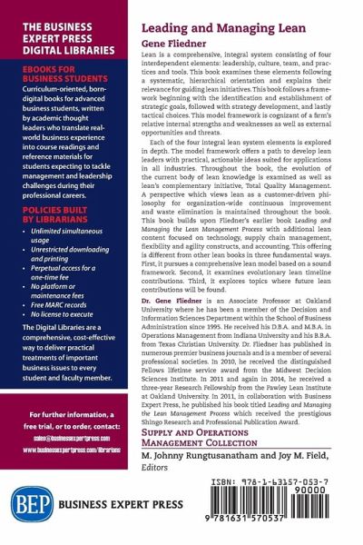 Lean is a comprehensive, integral system consisting of four interdependent elements: leadership, culture, team, and practices and tools. This book examines these elements following a systematic, hierarchical orientation and explains their relevance for guiding lean initiatives. It begins with the identification and establishment of strategic goals, followed with strategy development, and lastly tactical choices. This model framework is cognizant of a firm's relative internal strengths and weaknesses as well as external opportunities and threats. Each of the four integral lean system elements is explored in depth. The model framework offers a path to develop lean leaders with practical, actionable ideas suited for applications in all industries. Throughout the book, the evolution of the current body of lean knowledge is examined as well as lean's complementary initiative, total quality management. A perspective which views lean as a customer-driven philosophy for organization-wide continuous improvement and waste elimination is maintained throughout the book. This second edition builds upon the first edition with additional lean content focused on technology, supply chain management, flexibility and agility constructs, and accounting.