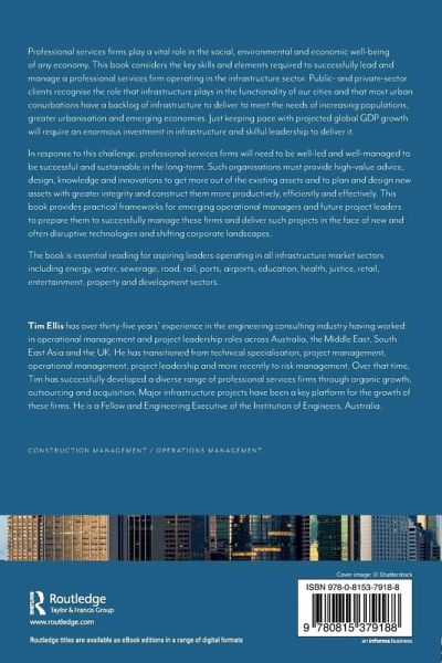 Professional services firms play a vital role in the social, environmental and economic well-being of any economy. This book considers the key skills and elements required to successfully lead and manage a professional services firm operating in the infrastructure sector. Public- and private-sector clients recognise the role that infrastructure plays in the functionality of our cities and that most urban conurbations have a backlog of infrastructure to deliver to meet the needs of increasing populations, greater urbanisation and emerging economies. Just keeping pace with projected global GDP growth will require an enormous investment in infrastructure and skilful leadership to deliver it. In response to this challenge, professional services firms will need to be well-led and well-managed to be successful and sustainable in the long-term. Such organisations must provide high-value advice, design, knowledge and innovations to get more out of the existing assets and to plan and design new assets with greater integrity and construct them more productively, efficiently and effectively. This book provides practical frameworks for emerging operational managers and future project leaders to prepare them to successfully manage these firms and deliver such projects in the face of new and often disruptive technologies and shifting corporate landscapes. The book is essential reading for aspiring leaders operating in all infrastructure market sectors including energy, water, sewerage, road, rail, ports, airports, education, health, justice, retail, entertainment, property and development sectors.