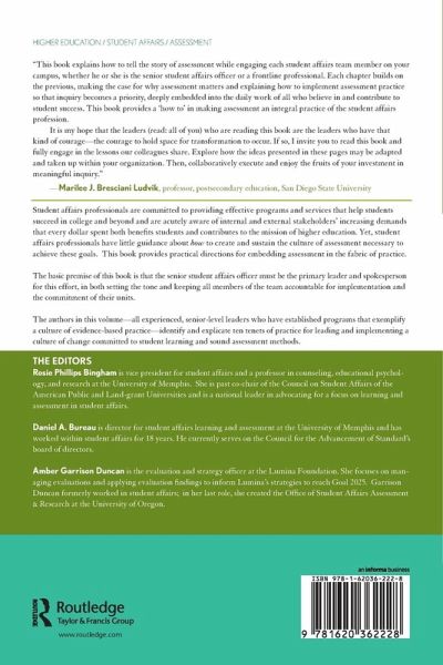 Rosie Phillips Bingham is Vice President for Student Affairs and a professor in Counseling, Educational Psychology, and Research at the University of Memphis. Bingham serves on the editorial board of the Journal of Career Assessment and is a past member of the editorial boards of In Session Journal of Clinical Psychology, the NASPA Journal, the Journal of College Student Development, the Journal of Counseling and Development, and The Counseling Psychologist. She is co-editor of Career Counseling and African Americans (2001) with Walsh, Brown, and Ward. She is past co-chair of the Council on Student Affairs within APLU and is a national leader in advocating for a focus on learning and assessment in Student Affairs. Daniel Bureau is Director for Student Affairs Learning and Assessment at the University of Memphis and has worked within student affairs for 18 years. In his role, he is tasked with helping departments within the Division of Student Affairs to develop assessment plans and collect evidence for annual reporting. Dan has been actively involved in the Student Affairs Assessment Leaders organization, as well as maintaining activity in the ACPA Commission for Assessment, Evaluation and Research. He currently serves on the Council for the Advancement of Standards board of directors. Dan has written articles on assessment in student affairs and presented over 20 workshops on this topic. Amber Garrison Duncan is the Evaluation and Strategy Officer at Lumina Foundation focusing on managing evaluations and applying evaluation findings to inform Lumina's strategies to reach Goal 2025. Amber also serves on Lumina's strategy work group focusing on new systems of quality credentials in higher education, including the Degree Qualifications Profile and Tuning. These activities allow her to draw upon her many years of campus-based experience designing co-curricular learning experiences and leading assessment. Previously, Amber worked in student affairs and in
