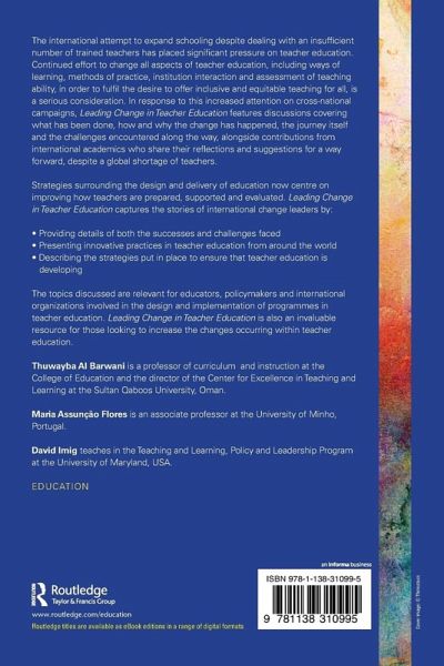 Part 1 - Framing change in Teacher Education; Leading Change for Teacher Education; Leadership for Change; Work for Understanding as Innovation in Brazilian Teacher Education; Part 2 - Changing Curriculum and Structure in Teacher Education; Understanding and enhancing change in post-Bologna pre-service teacher education: lessons from experience and research in Portugal; Curricular and policy-oriented reform as translated within teacher education: The Maltese journey -Montclair State University: An Analysis of Change; Part 3 - Teacher Accrediatation; Building the Collective Capacity for Excellence: The Experience of Accreditation of the College of Education in Oman; "Much Ado about Something" Accreditation of Teacher Education Programs in Egypt: When Negative Means Positive; Part 4 University - School Partnerships; Establishing Innovation at Schools: The Role of School Leaders; Changing teaching practice in South Africa schools: An examination of teacher development initiatives; Opportunities and challenges in the development of a new partnership model of teacher education: a Scottish perspective; Lighting the Way: Education true to the vision and the people; Part 5 - ICT and Teacher Education; Scholarship of Engagement (SoE): Knowledge Transfer Program (KTP) for Developmental; TeachNow as an Innovation for Teacher Education; Part 6 - Internationalization and the Role of Teacher Educators; Teacher preparation for a knowledge economy: Leading a paradigm shift in UAE education; Professional Development of Teacher Educators as a Tool Leading to Changes in Teacher Education; An Agenda for Leadership for Change in Teacher Education