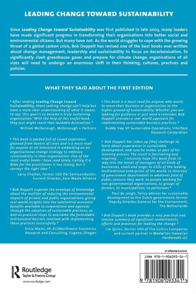 As the world struggles to cope with the growing threat of a global carbon crisis, Doppelt has revised one of the best books ever written about change management, leadership and sustainability to focus on de-carbonisation. Doppelt's research, presented in this hugely readable book, demystify the sustainability-change process by providing a theoretical framework and a methodology that managers can use to successfully transform their organisations to embrace sustainable development. Filled with case examples, interviews and checklists on how to move corporate and governmental cultures toward sustainability, the book argues that the key factors that facilitate change appear in the successful efforts at companies such as AstraZeneca, Nike, Starbucks, IKEA, Chiquita, Interface, Swisscom and Norm Thompson and in governmental efforts such as those in the Netherlands and Santa Monica in California. For these and other cutting-edge organisations, leading change is a philosophy for success. Leading Change toward Sustainability has been used by change leaders around the world to guide their internal global warming and sustainability organisational change initiatives. This new edition is essential reading for leaders from all types of organisations.