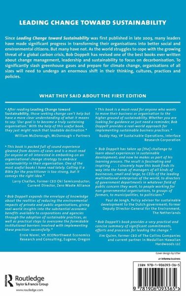 Foreword William McDonough Foreword Paul de Jongh Introduction to the Second Edition: Leading Change towards De-carbonisation Part I: Why some organisations succeed and others fail 1. A tale of two companies 2. What went wrong? 3. A primer on sustainability 4. Socioeconomic implications of sustainable development 5. Sustainability, governance and organisational change (116K) Part II: The wheel of change toward sustainability 6. Change the dominant mind-set that created the system through the imperative of achieving sustainability 7. Rearrange the parts of the system by organising deep, wide and powerful sustainability transition teams 8. Change the goals of the system by crafting an ideal vision and guiding principles of sustainability 9. Restructure the rules of engagement of the system by adopting source-based strategies 10. Shift the information flows of the system by tirelessly communicating the need, vision and strategies for achieving sustainability 11. Correct the feedback loops of the system by encouraging and rewarding learning and innovation 12. Adjust the parameters of the system by aligning systems and structures with sustainability 13. Aligning governance with sustainability 14. Closing thoughts on the change process Appendix A: Assessing your organisation's 'sustainability blunders' Appendix B: Assessing your governance system Appendix C: Assessing your sustainability change initiative Author's postscript Bibliography
