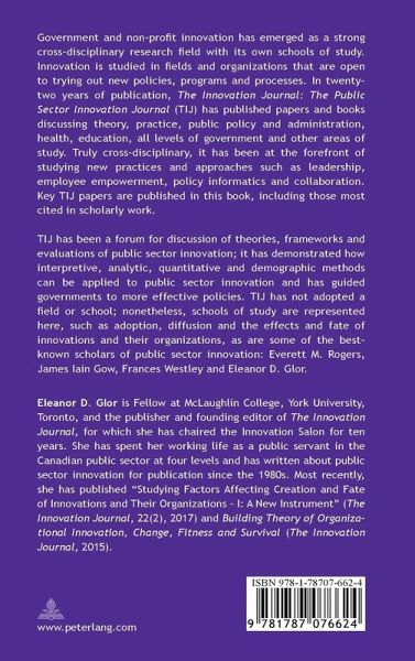 Government and non-profit innovation has emerged as a strong cross-disciplinary research field with its own schools of study. Innovation is studied in fields and organizations that are open to trying out new policies, programs and processes. In twenty-two years of publication, The Innovation Journal: The Public Sector Innovation Journal (TIJ) has published papers and books discussing theory, practice, public policy and administration, health, education, all levels of government and other areas of study. Truly cross-disciplinary, it has been at the forefront of studying new practices and approaches such as leadership, employee empowerment, policy informatics and collaboration. Key TIJ papers are published in this book, including those most cited in scholarly work. TIJ has been a forum for discussion of theories, frameworks and evaluations of public sector innovation; it has demonstrated how interpretive, analytic, quantitative and demographic methods can be applied to public sector innovation and has guided governments to more effective policies. TIJ has not adopted a field or school; nonetheless, schools of study are represented here, such as adoption, diffusion and the effects and fate of innovations and their organizations, as are some of the best-known scholars of public sector innovation: Everett M. Rogers, James Iain Gow, Frances Westley and Eleanor D. Glor.