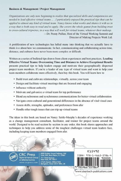 A proliferation of new technologies has lulled many into thinking that we actually have to think less about how we communicate. In fact, communicating and collaborating across time, distance, and cultures has never been more complex or difficult. Written as a series of bulleted tips drawn from client experiences and best practices, Leading Effective Virtual Teams: Overcoming Time and Distance to Achieve Exceptional Results presents practical tips to help leaders engage and motivate their geographically dispersed project team members. If you're a leader of any type of virtual team and want to help your team members collaborate more effectively, then buy this book. You will learn how to: Build trust and cultivate relationships, virtually, across your team Design and facilitate virtual meetings that are focused and engaging Influence without authority Motivate and galvanize a virtual team for top performance Blend asynchronous and synchronous communications for better virtual collaboration Navigate cross-cultural and generational differences in the absence of vital visual cues Assess skills, strengths, aptitudes, and preferences from afar Handle other tough issues that can trip up virtual teams The ideas in this book are based on Nancy Settle-Murphy's decades of experience working as a change management consultant, facilitator, and trainer for project teams around the world. Designed to be read section by section in any order, this book shares approaches and techniques to help you address some of the toughest challenges virtual team leaders face, including keeping team members engaged from afar.