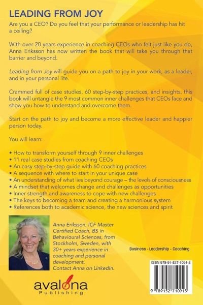 Leading from Joy Are you a CEO? Do you feel that your performance or leadership has hit a ceiling? With over 20 years experience of coaching CEOs who felt just like you do, Anna Eriksson has now written the book that will take you through that barrier and beyond. Leading from Joy will guide you on a path to joy in your work, as a leader and in your personal life. Crammed full of case studies, 60 step-by-step practices, and insights, this book will untangle the 9 most common inner challenges that CEOs face and show you how to understand and overcome them. Start on the path to joy and become a more effective leader and happier person today. You will get:How to transform yourself through 9 inner challenges 11 real case studies from coaching CEOs An easy step-by-step guide with 60 coaching practices A sequence with where to start in your unique case An understanding of what lies beyond courage - the levels of consciousness A mindset that welcomes change and challenges as opportunities Inner strength and awareness to cope with new challenges The keys to becoming a team and creating a harmonious system References both to academic science, the new sciences and spirit
