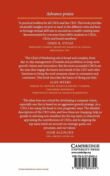 Figures; Tables; Contributors; Editor's acknowledgments; 1. Introduction leading within and across the functions Preston Bottger and Jean Louis Barsoux; Part I. The Business Imperatives: 2. The leadership imperative driving wealth creation Preston Bottger; 3. The talent imperative all CXOs must strengthen the company's talent pool Jean Louis Barsoux and Preston Bottger; 4. The learning imperative going offline to improve performance Jean Louis Barsoux and Preston Bottger; Part II. The CXOs: Within the Functions: 5. The Chief Marketing Officer creating, delivering and communicating value to customers Dominique Turpin and George Rädler; 6. The Chief Sales Officer sell, sell, sell! Jonathan Lachowitz and Preston Bottger; 7. The Chief Supply Chain Officer designing and managing lean and agile supply chains Carlos Cordón and Kim Sundtoft Hald; 8. The Chief Manufacturing Officer process execution, improvement and design Kim Sundtoft Hald; 9. The Chief Financial Officer a capital position Leif Sjoblom; 10. The Chief Technology Officer corporate navigator, agent of change and entrepreneur Jean Philippe Deschamps; 11. The Chief Information Officer achieving credibility, relevance and business impact Donald A. Marchand; 12. The Chief Human Resources Officer delivering people who can deliver Preston Bottger and Paul Vanderbroeck; 13. The Corporate Governance Officer from company secretary to manager of governance processes Ulrich Steger and Preston Bottger; 14. The Chief Communications Officer leading strategic communications Gordon Adler; 15. The SBU President perhaps the best job for the CEO in training Jonathan Lachowitz and Preston Bottger; 16. CXOs and the Line serving the internal customer Preston Bottger, Paul Vanderbroeck and Jean Louis Barsoux; Part III. The CEO and the Leadership Team Pulling it all Together: 17. From CXO to CEO the weight of accountability Jean Louis Barsoux and Preston Bottger; 18. The Chief Executive Officer orchestrating the whole Peter Lorange; 19. Relations among CXOs competing priorities spell trouble Jean Louis Barsoux; 20. The top team from executive group to executive team Jean Philippe Deschamps; Part IV. Conclusion: 21. Summary: the CXO challenge wealth creation by the executive team Preston Bottger and Jean Louis Barsoux; Index.