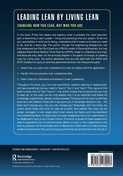 In Leading Lean by Living Lean, Philip Holt details and explains what is probably the most important part of becoming a Lean Leader -- living and practicing what you preach. To do this you must believe in what you're doing, understand what it means and what you need to do, and do it every day. The author, through his engineering background, has fully embraced the Plan-Do-Check-Act (PDCA) model of Deming / Shewhart but has adapted David Bovis' Believe-Think-Feel-Act (BTFA) model to understand why logic and facts are very often not the principal players in the game of change.