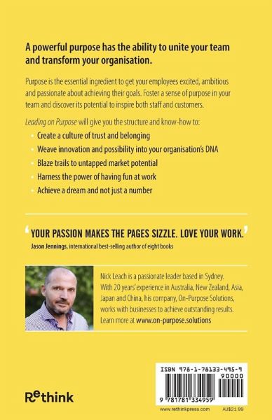 A powerful purpose has the ability to unite your team and transform your organisation Purpose is the essential ingredient to get your employees excited, ambitious and passionate about achieving their goals. Foster a sense of purpose in your team and discover its potential to inspire both staff and customers. Leading on Purpose will give you the structure and know-how to: ¿ Create a culture of trust and belonging ¿ Weave innovation and possibility into your organisation's DNA ¿ Blaze trails to untapped market potential ¿ Harness the power of having fun at work ¿ Achieve a dream and not just a number