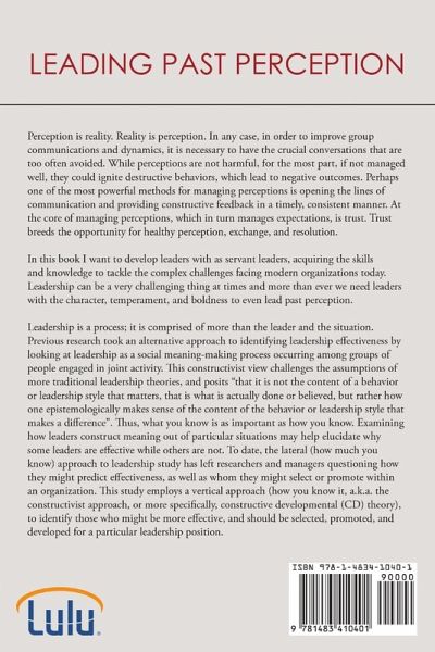 Perception is reality. Reality is perception. In any case, in order to improve group communications and dynamics, it is necessary to have the crucial conversations that are too often avoided. While perceptions are not harmful, for the most part, if not managed well, they could ignite destructive behaviors, which lead to negative outcomes. Perhaps one of the most powerful methods for managing perceptions is opening the lines of communication and providing constructive feedback in a timely, consistent manner. At the core of managing perceptions, which in turn manages expectations, is trust. Trust breeds the opportunity for healthy perception, exchange, and resolution. In this book I want to develop leaders with as servant leaders, acquiring the skills and knowledge to tackle the complex challenges facing modern organizations today. Leadership can be a very challenging thing at times and more than ever we need leaders with the character, temperament, and boldness to even lead past perception.