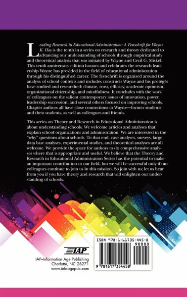 A volume in Research and Theory in Educational Administration Series Editors: Wayne K. Hoy, The Ohio State University and Michael DiPaola, The College of William and Mary Leading Research in Educational Administration: A Festschrift for Wayne K. Hoy is the tenth in a series on research and theory dedicated to advancing our understanding of schools through empirical study and theoretical analysis that was initiated by Wayne and Cecil G. Miskel. This tenth anniversary edition honors and celebrates the research leadership Wayne has provided in the field of educational administration through his distinguished career. The festschrift is organized around the analysis of school contexts and includes constructs Wayne and his protégés have studied and researched: climate, trust, efficacy, academic optimism, organizational citizenship, and mindfulness. It concludes with the work of colleagues on the salient contemporary issues of innovation, power, leadership succession, and several others focused on improving schools. Chapter authors all have close connections to Wayne - former students and their students, as well as colleagues and friends. This series on Theory and Research in Educational Administration is about understanding schools. We welcome articles and analyses that explain school organizations and administration. We are interested in the "why" questions about schools. To that end, case analyses, surveys, large data base analyses, experimental studies, and theoretical analyses are all welcome. We provide the space for authors to do comprehensive analyses where that is appropriate and useful. We believe that the Theory and Research in Educational Administration Series has the potential to make an important contribution to our field, but we will be successful only if our colleagues continue to join us in this mission. So join with us; let us hear from you if you have theory and research that will enlighten our understanding of schools.