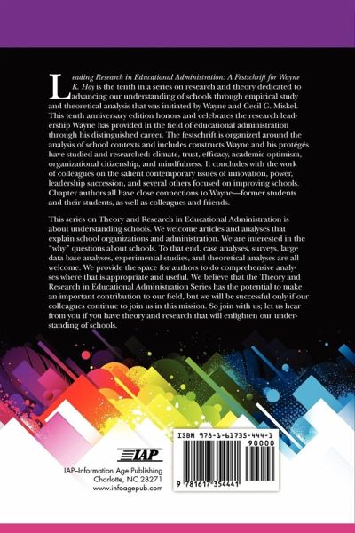 A volume in Research and Theory in Educational Administration Series Editors: Wayne K. Hoy, The Ohio State University and Michael DiPaola, The College of William and Mary Leading Research in Educational Administration: A Festschrift for Wayne K. Hoy is the tenth in a series on research and theory dedicated to advancing our understanding of schools through empirical study and theoretical analysis that was initiated by Wayne and Cecil G. Miskel. This tenth anniversary edition honors and celebrates the research leadership Wayne has provided in the field of educational administration through his distinguished career. The festschrift is organized around the analysis of school contexts and includes constructs Wayne and his protégés have studied and researched: climate, trust, efficacy, academic optimism, organizational citizenship, and mindfulness. It concludes with the work of colleagues on the salient contemporary issues of innovation, power, leadership succession, and several others focused on improving schools. Chapter authors all have close connections to Wayne - former students and their students, as well as colleagues and friends. This series on Theory and Research in Educational Administration is about understanding schools. We welcome articles and analyses that explain school organizations and administration. We are interested in the "why" questions about schools. To that end, case analyses, surveys, large data base analyses, experimental studies, and theoretical analyses are all welcome. We provide the space for authors to do comprehensive analyses where that is appropriate and useful. We believe that the Theory and Research in Educational Administration Series has the potential to make an important contribution to our field, but we will be successful only if our colleagues continue to join us in this mission. So join with us; let us hear from you if you have theory and research that will enlighten our understanding of schools.