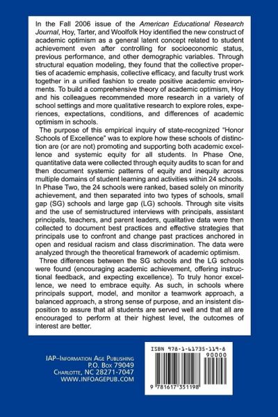 The purpose of this empirical inquiry of state-recognized "Honor Schools of Excellence" was to explore how these schools of distinction are (or are not) promoting and supporting both academic excellence and systemic equity for all students. In Phase One, quantitative data were collected through equity audits to scan for and then document systemic patterns of equity and inequity across multiple domains of student learning and activities within 24 schools. In Phase Two, the 24 schools were ranked, based solely on minority achievement, and then separated into two types of schools, small gap (SG) schools and large gap (LG) schools. Through site visits (n=16) and the use of semi-structured interviews with principals, assistant principals, teachers, and parent leaders (n=80), qualitative data were then collected to document best practices and effective strategies that principals use to confront and change past practices anchored in open and residual racism and class discrimination. The data were analyzed through the theoretical framework of academic optimism. Three differences between the SG schools and the LG schools were found (encouraging academic achievement, offering instructional feedback, and expecting excellence). To truly honor excellence, we need to embrace equity. As such, in schools where principals support, model, and monitor a teamwork approach, a balanced approach, a strong sense of purpose, and an insistent disposition to assure that all students are served well and that all are encouraged to perform at their highest level, the outcomes of interest are better.