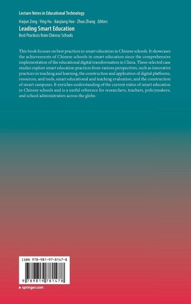 This book focuses on best practices in smart education in Chinese schools. It showcases the achievements of Chinese schools in smart education since the comprehensive implementation of the educational digital transformation in China. These selected case studies explore smart education practices from various perspectives, such as innovative practices in teaching and learning, the construction and application of digital platforms, resources, and tools, smart educational and teaching evaluation, and the construction of smart campuses. It enriches understanding of the current status of smart education in Chinese schools and is a useful reference for researchers, teachers, policymakers, and school administrators across the globe.