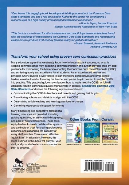 Transform your school using proven core curriculum practices This practical guide provides step-by-step guidance for overcoming the barriers to adopting the Common Core State Standards and achieving equity and excellence for all students. An experienced teacher and principal, Cheryl Dunkle shows leaders how to lead implementation of the CCSS and continuous quality improvement in schools. This practical guide addresses these key issues and more: Communicating the CCSS to teachers and parents and attaining their buy-in Transitioning schools and districts to align with the CCSS Determining which teaching and learning practices need to change Garnering resources and support for reforms Included are professional learning resources such as guiding questions, an annotated bibliography, and a list of helpful references.