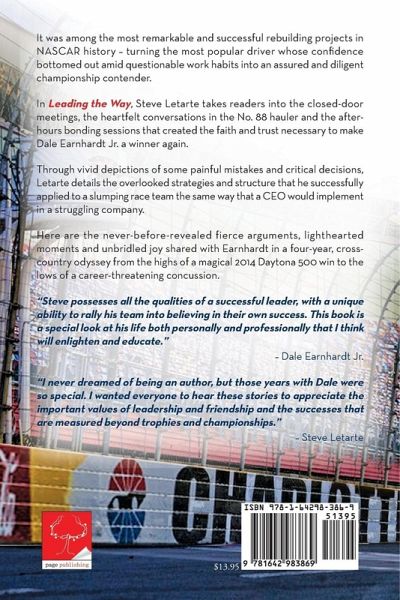 It was among the most remarkable and successful rebuilding projects in NASCAR history - turning the most popular driver whose confidence bottomed out amid questionable work habits into an assured and diligent championship contender. In Leading the Way, Steve Letarte takes readers into the closed-door meetings, the heartfelt conversations in the No. 88 hauler and the after-hours bonding sessions that created the faith and trust necessary to make Dale Earnhardt Jr. a winner again. Through vivid depictions of some painful mistakes and critical decisions, Letarte details the overlooked strategies and structure that he successfully applied to a slumping race team the same way that a CEO would implement in a struggling company. Here are the never-before-revealed fierce arguments, lighthearted moments and unbridled joy shared with Earnhardt in a four-year, cross-country odyssey from the highs of a magical 2014 Daytona 500 win to the lows of a career-threatening concussion. "Steve possesses all the qualities of a successful leader, with a unique ability to rally his team into believing in their own success. This book is a special look at his life both personally and professionally that I think will enlighten and educate." - Dale Earnhardt Jr. "I never dreamed of being an author, but those years with Dale were so special. I wanted everyone to hear these stories to appreciate the important values of leadership and friendship and the successes that are measured beyond trophies and championships." - Steve Letarte