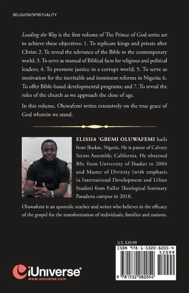 Leading the Way is the first volume of The Prince of God series set to achieve these objectives: 1. To replicate kings and priests after Christ; 2. To reveal the relevance of the Bible to the contemporary world; 3. To serve as manual of Biblical facts for religious and political leaders; 4. To promote justice in a corrupt world; 5. To serve as motivation for the inevitable and imminent reforms in Nigeria; 6. To offer Bible-based developmental programs; and 7. To reveal the roles of the church as we approach the close of age. In this volume, Oluwafemi writes extensively on the true grace of God wherein we stand.