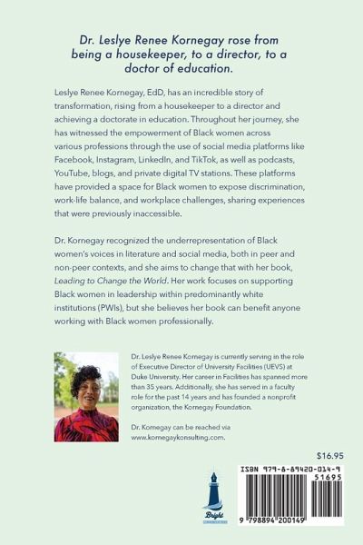 Leslye Renee Kornegay, EdD, rose from being a housekeeper, to a director, to a doctor of education. Through those years, a number of platforms emerged that gave other voices for Black women across all professional genres to speak up about the "-ism's," work and life struggles, and challenges and barriers in the workplace. The rise of Facebook, Instagram, LinkedIn, X, Tik Tok, podcasts, YouTube, blogs, and private TV digital stations opened up a wealth of Black women's experience that were not accessible before. Dr. Kornegay realizes that she was never alone in her experiences as a Black woman in the South, but she understood that Black women's voices were not as prevalent in the literature and social media as they are today-in both peer and non-peer contexts. It is Dr. Kornegay's hope that her book Leading to Change the World, can be used as a foundational piece to aid other Black women in their journeys. Although her focus and research have been on Black women in leadership, specifically in primarily white institutions (PWIs), she believes this book serves as a resource for anyone working with Black women in any professional capacity.
