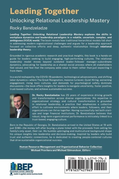 Leading Together: Unlocking Relational Leadership Mastery explores the shifts in workplace dynamics and leadership paradigms in a volatile, uncertain, complex, and ambiguous (VUCA) world. The book reveals how traditional hierarchical models fall short in addressing modern organizational challenges and argues for a leadership approach focused on collective efforts and deep, authentic relationships through Relational Leadership theory. Grounded in rigorous academic research and practical insights, this book is a hands-on guide for leaders seeking to build engaging, high-performing cultures. The relational leadership model, highlighted in this book, moves beyond outdated leader-follower manager-subordinate dynamics, advocating for leadership as a shared process where all stakeholders feel valued, and feel the company adds value to them rather than just expecting it from them. In a world reshaped by the COVID-19 pandemic, technological advancements, and shifting labor dynamics-where The Great Resignation, massive turnover, Quiet Hiring, worsening engagement, rising toxic cultures, and demands for psychological safety at workplace dominate discussions-the book offers insights for leaders to navigate uncertainty, foster positive, trust-based cultures, and achieve sustainable success.
