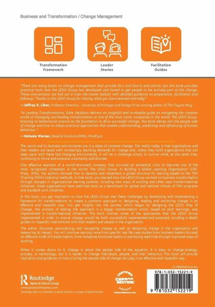 In Leading Transformations, author Gitte Jakobson delivers an insightful and invaluable guide on navigating the complex world of managing and leading transformation at one of the most iconic companies in the world: The LEGO Group. Drawing on behavioural science as the foundation to drive successful change, this book delves into the people side of change and how to adopt practical approaches that enable understanding, predicting and influencing of human behaviour. Leading Transformations provides a compelling framework with real-life examples, tools and strategies needed to manage and lead change effectively. Whether you're a people manager, change practitioner or business leader looking to make a lasting impact, this book will provide you with invaluable insights to develop your own leadership capabilities and accelerate your impact in leading change.