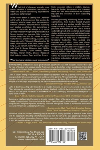 By John J. Sosik, The Pennsylvania State University, Great Valley School of Graduate Professional Studies What kind of character strengths must leaders develop in themselves and others to create and sustain extraordinary organizational growth and performance? In this updated and expanded second edition, the author, John J. Sosik, answers this question by reviewing what is known about the connection between authentic transformational leadership and positive psychology. He summarizes a wealth of leadership knowledge in a unique collection of captivating stories about 25 famous leaders from business, history and pop culture: Aung San Suu Kyi, John F. Kennedy, Maya Angelou, Bill Gates, Brian Wilson, Rosa Parks, Martin Luther King, Jr., Joe Namath, Malala Yousafzai, Mother Teresa, Angelina Jolie, Pope Saint John Paul II, Shirley Chisholm, Sheryl Sandberg, Andy Griffith, Margaret Thatcher, Oprah Winfrey, Nelson Mandela, Warren Buffet, Carlos Ghosn, Eleanor Roosevelt, Herb Kelleher, Steve Jobs, Johnny Cash, and Fred Rogers. What do these leaders have in common? Each possesses virtues of wisdom, courage, humanity, justice, temperance, and transcendence and their associated character strengths that form the foundation of their outstanding leadership. Besides generating astonishing results for their organizations, these leaders reaped numerous physical, mental, social and spiritual benefits from their strong character. Their stories teach readers leadership principles that they too can apply to achieve sustainable growth and excellence. The author includes dozens of interesting examples, vivid anecdotes, and clear guidelines to offer readers an in-depth look at how character and virtue forms the moral fiber of authentic transformational leadership. Individuals currently in leadership positions as well as aspiring leaders will find the book's conversational style, fascinating stories, and practical guidelines both useful and inspiring.