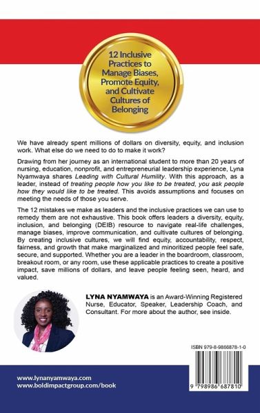 We have already spent millions of dollars on diversity, equity, and inclusion work. What else do we need to do to make it work? Drawing from her journey as an international student to more than 20 years of nursing, education, nonprofit, and entrepreneurial leadership experience, Lyna Nyamwaya shares Leading with Cultural Humility. When we lead with a cultural humility approach, instead of saying, "I treat people how I like to be treated," we ask people how they would like to be treated, and then we treat them as such. This avoids assumptions and focuses on meeting the needs of those we serve. The 12 mistakes we make as leaders and the inclusive practices we can use to remedy them are not exhaustive. This book offers leaders a diversity, equity, inclusion, and belonging (DEIB) resource to navigate real-life challenges, manage biases, improve communication, and cultivate cultures of belonging. By creating inclusive cultures, we will find equity, accountability, respect, fairness, and growth that make marginalized and minoritized people feel safe, secure and supported. Whether you are a leader in the boardroom, classroom, breakout room, or any room, use these applicable practices to create a positive impact, save millions of dollars, and leave people feeling seen, heard, and valued.