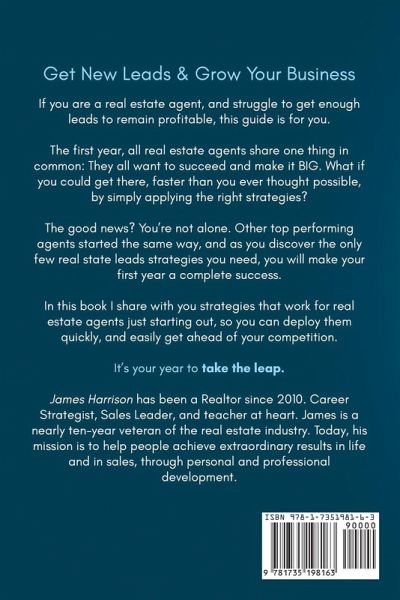 Discover Unlimited Lead Strategies that Works and Win your First Year in Real Estate. (EASY). Read on.. You may not know this but.. According to NAR® : " 87% of all new agents fail after five years in the industry and only 13% make it." Why so many real estate agents fail? Great Question. Here's a hint: Leads, Leads, Leads. "More hot qualified leads means more sales".. right? But More importantly.. How can you easily get those precious real estate leads... without wasting so much money on marketing that doesn't generate business? Well, after a decade of trial and error.. James Harrison, Career Strategist and Real Estate Expert shares his top-performing lead strategies that will consistently bring hot leads to your door. These powerful strategies fly under the radar.. Most of them are misunderstood and some misapplied. In this Guide, you'll discover: ¿ His Secret 14-Touchpoint Follow-up System that doubled his sales in just a few months. Easy and simple to implement for new real estate agents. Hands-Free and automated. ¿ The right lead sources you need to build a full pipeline with less time, stress and money wasted. ¿ How to get LinkedIn to deliver hot leads directly to your inbox daily. ¿ Top-performing real estate lead strategies all in One book. ¿ The **Ins and outs ** of using lead generation especially for real estate agents to find qualified hot leads. ¿ Absolutely fundamental (but little known) tactics to generate a non-stop supply of seller listing leads. And that's just some of the GOOD stuff to rapidly grow a healthy pipeline of leads. Look.. This is NOT your typical real estate book. James distilled his decade of real estate into bite-size actionable strategies.. Simple enough for the beginner real estate agent to read, apply and get results FAST. No fluff, filler, or vague theories here. This one book could add thousands of dollars to your bottom line every year. (Yes, seriously.) Now, what you choose to do with this information is up to you... But I CAN tell you this: if you want to make this Year a success, I'd suggest to simply.. ¿Get your copy now at this low price before it's too late.¿