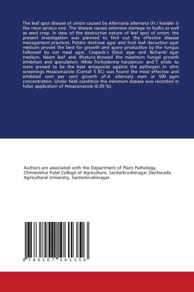 The leaf spot disease of onion caused by Alternaria alternata (Fr.) Keissler is the most serious one. The disease causes extensive damage to bulbs as well as seed crop. In view of the destructive nature of leaf spot of onion, the present investigation was planned to find out the effective disease management practices. Potato dextrose agar and host leaf decoction agar medium proved the best for growth and spore production by the fungus followed by oat meal agar, Czapeck's (Dox) agar and Richards' agar medium. Neem leaf and dhatura showed the maximum fungal growth inhibition and sporulation. While Trichoderma harzianum and T. viride to were proved to be the best antagonist against the pathogen. In vitro screenings Hexaconazole (Contaf 5 EC) was found the most effective and inhibited cent per cent growth of A. alternata even at 500 ppm concentration. Under field condition the minimum disease was recorded in foliar application of Hexaconazole (0.05 %).