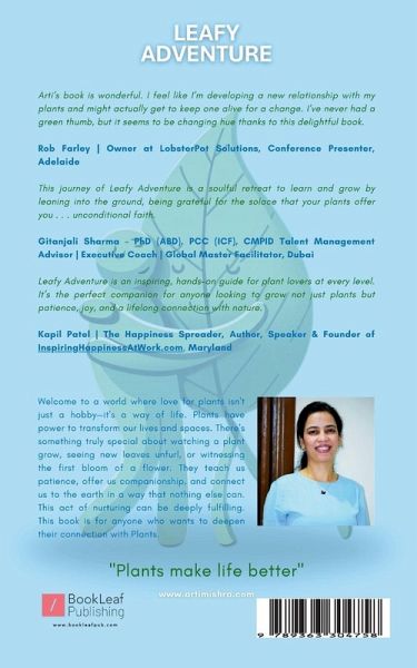 Arti's book is wonderful. I feel like I'm developing a new relationship with my plants and might actually get to keep one alive for a change. I've never had a green thumb, but it seems to be changing hue thanks to this delightful book. - Rob Farley Owner at LobsterPot Solutions, Conference Presenter, Adelaide This journey of Leafy Adventure is a soulful retreat to learn and grow by leaning into the ground, being grateful for the solace that your plants offer you . . . unconditional faith. - Gitanjali Sharma - PhD (ABD), PCC (ICF), CMPID Talent Management Advisor Executive Coach Global Master Facilitator, Dubai Leafy Adventure is an inspiring, hands-on guide for plant lovers at every level. It's the perfect companion for anyone looking to grow not just plants but patience, joy, and a lifelong connection with nature. - Kapil Patel The Happiness Spreader, Author, Speaker & Founder of InspiringHappinessAtWork.com, Maryland Welcome to a world where love for plants isn't just a hobby-it's a way of life. Plants have power to transform our lives and spaces. There's something truly special about watching a plant grow, seeing new leaves unfurl, or witnessing the first bloom of a flower. They teach us patience, offer us companionship, and connect us to the earth in a way that nothing else can. This act of nurturing can be deeply fulfilling. This book is for anyone who wants to deepen their connection with Plants. ""Plants make life better""