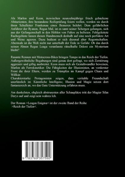 Als Marlon und Keon, inzwischen neunzehnjährige frisch gebackene Abiturienten, ihre bestandene Reifeprüfung feiern wollen, werden sie durch ihren Schulleiter Frankenau eines Besseren belehrt. Dem gefährlichen Anführer der Ryanen, Regus Mal, ist es samt seiner Schergen gelungen, sich aus der Gefangenschaft in den Höhlen von Falios zu befreien. Fehlgeleitete Rachegelüste lassen diesen Hundmensch deshalb auf eine noch perfidere Art und Weise agieren. Dazu bedient er sich diesmal alter Regentschaften. Abermals ist die Welt nicht nur unterhalb der Erde in Gefahr. Ob das durch seinen Ahnen Regus Leaga veranlasste rätselhafte Dekret ein Mysterium bleibt? Rasante Rennen mit Motocross-Bikes bringen Tempo in das Reich der Tiefen. Außergewöhnliche Begabungen sind genau dort gefragt, wo sich Zerstörung aggressiv und giftig ausbreitet. Keon muss sich als Gestaltwandler beweisen, Marlon als Ferrokinetiker. Die Fähigkeiten der Illusionisten, an vorderster Front die ihrer Eltern, werden zu Trümpfen im Kampf gegen Chaos und Willkür. Charakterstarke Protagonisten zeigen, dass veritable Freundschaft unerlässlich ist. Künstliche Intelligenz, Illusion und Magie setzen dort fantasiereich an, wo das Gute Unterstützung erfahren muss. Am dunkelsten, obgleich abstrusesten aller Schauplätze tritt der Magier Silas Derys auf und zeigt sein wahres Ich. Der Roman "Leagas Enigma" ist der zweite Band der Reihe "Reich der Tiefen".