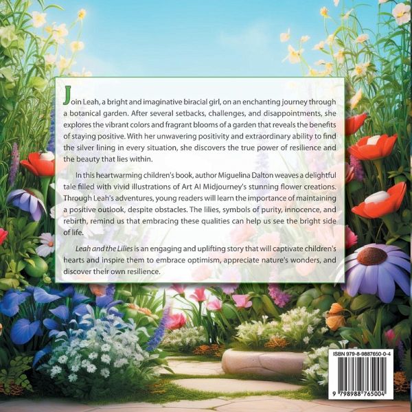 Join Leah, a bright and imaginative biracial girl, on an enchanting journey through a botanical garden. After several setbacks, challenges, and disappointments, she explores the vibrant colors and fragrant blooms of a garden that reveals the benefits of staying positive. With her unwavering positivity and extraordinary ability to find the silver lining in every situation, she discovers the true power of resilience and the beauty that lies within. In this heartwarming children's book, author Miguelina Dalton weaves a delightful tale filled with vivid illustrations of Art AI Midjourney's stunning flower creations. Through Leah's adventures, young readers will learn the importance of maintaining a positive outlook, despite obstacles. The lilies, symbols of purity, innocence, and rebirth, remind us that embracing these qualities can help us see the bright side of life. Leah and the Lilies is an engaging and uplifting story that will captivate children's hearts and inspire them to embrace optimism, appreciate nature's wonders, and discover their own resilience.