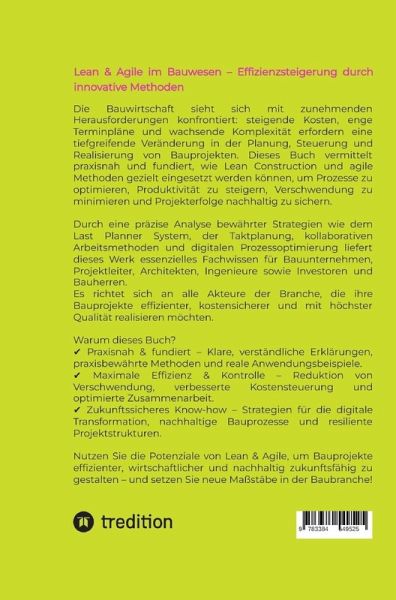 "Lean und Agile im Bauwesen" ist ein grundlegendes Werk für alle Fachleute in der Baubranche, die daran interessiert sind, ihre Projektmanagement-Fähigkeiten zu verbessern und ihre Projekte effizienter und effektiver zu gestalten. Das Buch bietet eine tiefgehende Einführung in die Prinzipien des Lean Managements und der agilen Methodik, adaptiert für die spezifischen Herausforderungen und Gegebenheiten des Bauwesens.Das Buch beginnt mit einer klaren Erklärung der Kernprinzipien von Lean und Agile, einschließlich der Geschichte und der philosophischen Grundlagen dieser Ansätze. Es wird erläutert, wie diese Konzepte, die ursprünglich in der Produktion und Softwareentwicklung entwickelt wurden, erfolgreich auf die Baubranche übertragen werden können, um Projekte schneller und mit weniger Verschwendung durchzuführen.Ein wesentlicher Teil des Buches widmet sich der Wertstromanalyse und anderen Lean-Techniken, die darauf abzielen, Verschwendung zu minimieren und den Wert für den Kundenzu maximieren. Praktische Anleitungen und Schritt-für-Schritt-Methoden helfen den Lesern, ihre eigenen Bauprozesse zu analysieren und zu verbessern. Dies führt zu kürzeren Durchlaufzeiten, geringeren Kosten und einer insgesamt höheren Qualität der Bauvorhaben.Das Buch stellt zudem agile Projektmanagement-Methoden wie Scrum und Kanban vor und zeigt auf, wie diese Techniken in Bauprojekten angewendet werden können, um Flexibilität und Anpassungsfähigkeit zu erhöhen, während gleichzeitig eine effektive Kontrolle über den Fortschritt der Projekte gewährleistet wird. Durch realistische Fallstudien und Beispiele aus der Praxis bekommen die Leser ein Gefühl dafür, wie Lean- und Agile-Methoden in der Realität umgesetzt werden können, inklusive der damit verbundenen Herausforderungen und Erfolge.Ein weiterer wichtiger Aspekt des Buches ist die Betrachtung der Nachhaltigkeit und Effizienz. Es wird dargestellt, wie durch die Anwendung von Lean- und Agile-Praktiken Bauvorhaben nachhaltiger und energieeffizienter gestaltet werden können, indem Ressourcen optimiert und Abfall minimiert wird.Die Zielgruppe des Buches umfasst eine breite Palette von Berufsgruppen in der Baubranche, darunter Bauunternehmer, Projektleiter, Architekten, Ingenieure und sogar Studierende, die eine Karriere im Bauwesen anstreben. "Lean und Agile im Bauwesen" richtet sich an alle, die ihre Projekte modernisieren und ihre Arbeitsweise optimieren möchten, um sich in einem wettbewerbsintensiven Markt hervorzuheben und ihre Projekte erfolgreicher, kostengünstiger und qualitativ hochwertiger zu realisieren.