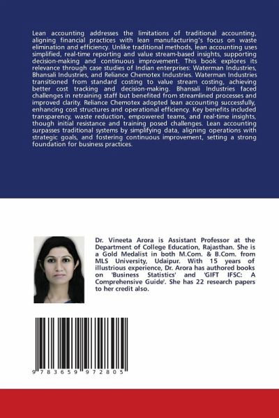 Lean accounting addresses the limitations of traditional accounting, aligning financial practices with lean manufacturing's focus on waste elimination and efficiency. Unlike traditional methods, lean accounting uses simplified, real-time reporting and value stream-based insights, supporting decision-making and continuous improvement. This book explores its relevance through case studies of Indian enterprises: Waterman Industries, Bhansali Industries, and Reliance Chemotex Industries. Waterman Industries transitioned from standard costing to value stream costing, achieving better cost tracking and decision-making. Bhansali Industries faced challenges in retraining staff but benefited from streamlined processes and improved clarity. Reliance Chemotex adopted lean accounting successfully, enhancing cost structures and operational efficiency. Key benefits included transparency, waste reduction, empowered teams, and real-time insights, though initial resistance and training posed challenges. Lean accounting surpasses traditional systems by simplifying data, aligning operations with strategic goals, and fostering continuous improvement, setting a strong foundation for business practices.