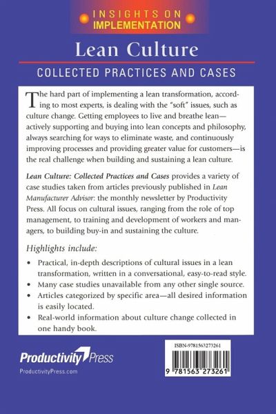 The hard part of implementing a lean transformation, according to most experts, is dealing with the "soft" issues, such as culture change. Getting employees to live and breathe lean -- actively supporting and buying into lean concepts and philosophy, always searching for ways to eliminate waste, and continuously improving processes and providing greater value for customers -- is the real challenge when building and sustaining a lean culture. Lean Culture: Collected Practices and Cases provides a variety of case studies taken from articles previously published in Lean Manufacturer Advisor: the monthly newsletter by Productivity Press. All focus on cultural issues, ranging from the role of top management, to training and development of workers and managers, to building buy-in and to sustaining the culture.Highlights include: Practical, in-depth descriptions of cultural issues in a lean transformation, written in a conversational, easy-to-read style. Many case studies unavailable from any other single source. Articles categorized by specific area - all desired information is easily located. Real-world information about culture change collected in one handy book.