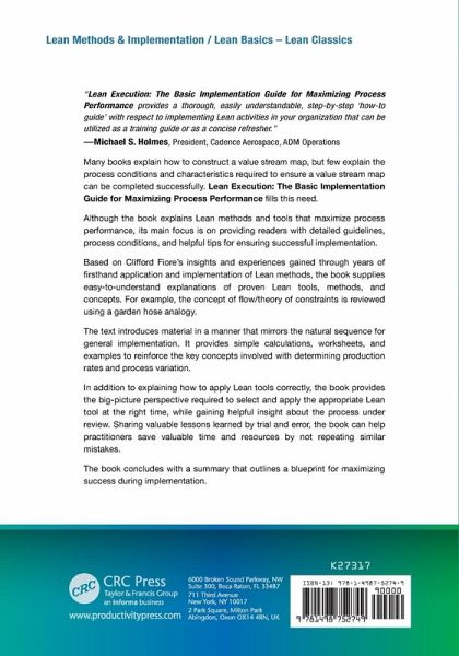 Many books explain how to construct a value stream map, but few explain the process conditions and characteristics required to ensure a value stream map can be completed successfully. Lean Execution: The Basic Implementation Guide for Maximizing Process Performance fills this need. Although the book explains Lean methods and tools that maximize process performance, its main focus is on providing readers with detailed guidelines, process conditions, and helpful tips for ensuring successful implementation. Based on Clifford Fiore's insights and experiences gained through years of firsthand application and implementation of Lean methods, the book supplies easy-to-understand explanations of proven Lean tools, methods, and concepts. For example, the concept of flow/theory of constraints is reviewed using a garden hose analogy. The text introduces material in a manner that mirrors the natural sequence for general implementation. It provides simple calculations, worksheets, and examples to reinforce the key concepts involved with determining production rates and process variation. In addition to explaining how to apply Lean tools correctly, the book provides the big picture perspective required to select and apply the appropriate Lean tool at the right time, while gaining helpful insight about the process under review. Sharing valuable lessons learned by trial and error, the book can help practitioners save valuable time and resources by not repeating similar mistakes. The book concludes with a summary that outlines a blueprint for maximizing success during implementation. Clifford Fiore has spent more than 30 years at a Fortune 500 company and is a recognized leader in applying Lean and Six Sigma methodologies. He is also a certified black belt and Lean expert. Through his work in adapting process improvement techniques in engineering, manufacturing, and the supply chain, he has emerged as an industry leader in implementing concepts towards reducing product cost, quality defects, and development cycle times.
