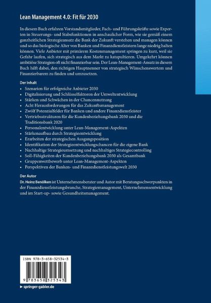 Szenarien für "fitte 2030".- Zehn Herausforderungen für Zukunftsmanagement.- Acht Optionen für Banken und Finanzdienstleister.- Stärken-Aufbau durch Strategieentwicklung.- Erarbeiten der strategischen Ausgangssituation.- Identifikation der Strategieentwicklungschancen.- Nachhaltige Strategie-Umsetzung und -Controlling.- Soll-Fähigkeiten der Bank 2020 plus.- Gruppenwettbewerb unter Lean-Banking-Aspekten.- Perspektiven der Bankenwelt 2030.