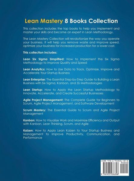 Lean Mastery Collection - 8 Books in 1 This collection includes the top books to help you implement and master your skills and become an expert in Lean Methodology. The Lean Mastery Collection will revolutionize the way you operate your business. It will help you remove waste and improve speed, optimize your business for increased production for a lower cost. If you want to:Learn how you can manage your team and your organization better without the information clutter Get the most out of your time and money in every step of your work process Resolve the problems with the efficiency of your current process Get the most out of people without stretching them to the limit Get a bird's eye view of the overall workflow of your business And much more Then this is the book for you! This collection includes: Lean Six Sigma Simplified: How to Implement the Six Sigma Methodology to Improve Quality and Speed Lean Analytics: How to Use Data to Track, Optimize, Improve and Accelerate Your Startup Business Lean Enterprise: The Essential Step-by-Step Guide to Building a Lean Business with Six Sigma, Kanban, and 5S Methodologies Lean Startup: How to Apply the Lean Startup Methodology to Innovate, Accelerate, and Create Successful Businesses Agile Project Management: The Complete Guide for Beginners to Scrum, Agile Project Management, and Software Development Scrum Mastery: The Essential Guide to Scrum and Agile Project Management Kanban: How to Visualize Work and Maximize Efficiency and Output with Kanban, Lean Thinking, Scrum, and Agile Kaizen: How to Apply Lean Kaizen to Your Startup Business and Management to Improve Productivity, Communication, and Performance Scroll up, click "Buy Now" and get your copy of the Lean Mastery Collection today!