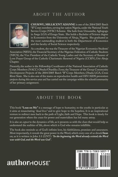ABOUT THE BOOK This book "Lean on Me" is a message of hope to humanity; to the youths in particular as it aims at resuscitating "dead lives" and giving hope to the hopeless. It is also an exposé to the dynamics of life, as it presents us with the clues that would help us understand the realities of life, above which is God who remains infallible. The book also reminds us of God's infinite love, his faithfulness, promises and assurances. Most importantly, it reveals the great power in the Word, which every one of us should lean on; as it is written in John 1:1 (GNT): "In the beginning the Word already existed; the Word was with God, and the Word was God". "In everything, the book is a good starting point for a budding Christian writer". - Iheagwam A. White. "An inspirational venture to redirect men back to the path of Light and Hope" - Nkuma, O.U. "This book is very timely for our generation where the craze for materialism has led many astray" - Okon Akpan Mbuk "God is above all our problems. This is what makes him supreme, but we must take the problems before him first, as clearly shown in this book". - J. Oguegbune-Okwuenu