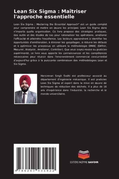 Lean Six Sigma : Mastering the Essential Approach" est un guide complet pour comprendre et mettre en oeuvre les principes Lean Six Sigma dans n'importe quelle organisation. Ce livre propose des stratégies pratiques, des outils et des études de cas pour rationaliser les opérations, améliorer l'efficacité et atteindre l'excellence. Les lecteurs apprendront à identifier les opportunités d'amélioration, à éliminer les gaspillages, à réduire les défauts et à optimiser les processus en utilisant la méthodologie DMAIC (Définir, Mesurer, Analyser, Améliorer, Contrôler). Que vous soyez novice ou praticien expérimenté, ce livre vous apporte les connaissances et les compétences nécessaires pour réussir dans l'environnement commercial concurrentiel d'aujourd'hui grâce à la puissante combinaison des méthodologies Lean et Six Sigma.