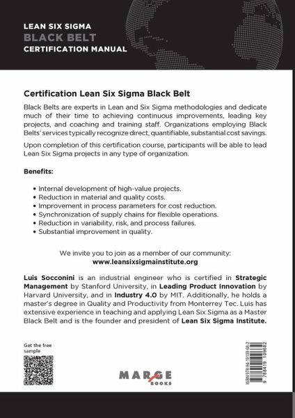 Black belts are experts in Lean and Six Sigma methodologies, and spend 80% of their time implementing improvements, leading projects and certifying other personnel. With the Black Belt Certification you will acquire the capacity to lead Lean Six Sigma projects in any type of organization. Some of its benefits are: ¿ Significant reduction of internal costs with customers and suppliers. ¿ Design of new job parameters. ¿ Coordinate the supply chain to achieve comprehensive flexibility. ¿ Instill a long-term and high impact organizational culture. ¿ Reduction of variability, risks and failures in processes. ¿ Substantial improvement in quality.