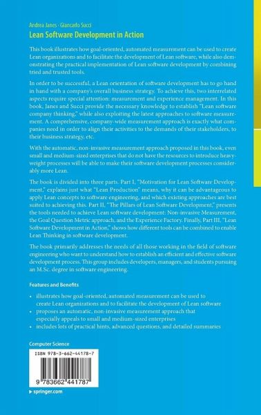 The book is divided into three parts. Part I, "Motivation for Lean Software Development," explains just what "Lean Production" means, why it can be advantageous to apply Lean concepts to software engineering, and which existing approaches are best suited to achieving this. Part II, "The Pillars of Lean Software Development," presents the tools needed to achieve Lean software development: Non-invasive Measurement, the Goal Question Metric approach, and the Experience Factory. Finally, Part III, "Lean Software Development in Action," shows how different tools can be combined to enable Lean Thinking in software development.