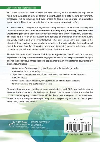 The Japan Institute of Plant Maintenance defines safety as the maintenance of peace of mind. Without peace of mind, or the serenity brought about by a safe working environment, employees will be unwilling and even unable to focus their energies on production improvement. Thus, it can be said that all improvement begins with safety. Winner of a 2013 Shingo Research and Professional Publication Award! A how-to manual on the proper integration of safety and environmental sustainability with Lean implementations, Lean Sustainability: Creating Safe, Enduring, and Profitable Operations provides a proven recipe for achieving safety and sustainability excellence. This book is the result of the author's two decades of experience implementing Lean; Safety, Health, and Environmental (SHE); and sustainability processes in the chemical, food, and consumer products industries. It unveils valuable lessons learned and little-known tips for eliminating waste and increasing process efficiency-while reducing safety incidents and the overall impact on the environment. The text illustrates how to use the SHE Pillar as a gateway to continuous improvement, regardless of the improvement methodology you use. Bolstered with proven methodologies and real-world advice, it introduces novel approaches for achieving safety and sustainability excellence, including: Autonomous Safety-supplying employees with the knowledge, skills, and motivation to work safely Triple Zero-the achievement of zero accidents, zero environmental incidents, and zero losses Green Value Stream Mapping-the application of Value Stream Mapping to environmental and sustainability issues Although there are many books on Lean, sustainability, and SHE, few explain how to integrate these dynamic tools. Walking you through this process, this book supplies the tools to create a synergy that will boost efficiencies across all segments of your business. Follow its advice and you'll be on your way to making your organization and employees Lean, green, and serene.