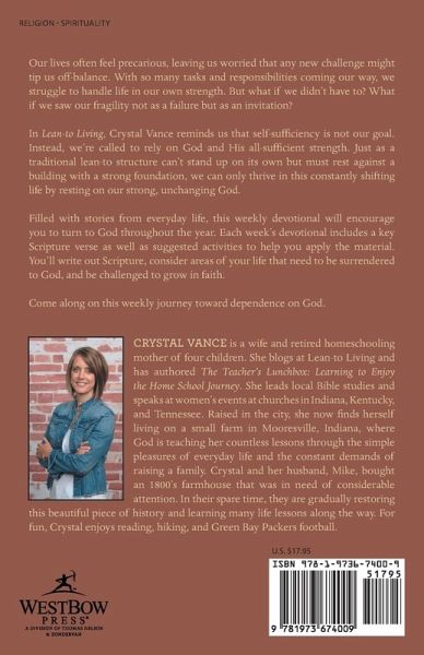 Our lives often feel precarious, leaving us worried that any new challenge might tip us off-balance. With so many tasks and responsibilities coming our way, we struggle to handle life in our own strength. But what if we didn't have to? What if we saw our fragility not as a failure but as an invitation? In Lean-to Living, Crystal Vance reminds us that self-sufficiency is not our goal. Instead, we're called to rely on God and His all-sufficient strength. Just as a traditional lean-to structure can't stand up on its own but must rest against a building with a strong foundation, we can only thrive in this constantly shifting life by resting on our strong, unchanging God. Filled with stories from everyday life, this weekly devotional will encourage you to turn to God throughout the year. Each week's devotional includes a key Scripture verse as well as suggested activities to help you apply the material. You'll write out Scripture, consider areas of your life that need to be surrendered to God, and be challenged to grow in faith. Come along on this weekly journey toward dependence on God.
