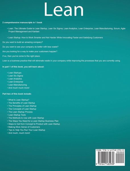 If you want to avoid waste and create wealth in your business, then keep reading... 2 comprehensive manuscripts in 1 book Lean: The Ultimate Guide to Lean Startup, Lean Six Sigma, Lean Analytics, Lean Enterprise, Lean Manufacturing, Scrum, Agile Project Management and Kanban Lean Startup: How to Work Smarter and Not Harder While Innovating Faster and Satisfying Customers Do you want to build an amazing company? Do you want to see your company do better with less waste? Are you looking for a way to make your customers happier? If so, then you've come to the right place. Lean is a business practice that will eliminate waste in your company while improving the processes that you are currently using. In part 1 of this book, you will learn about: Lean Startups Lean Six Sigma Lean Analytics Lean Enterprise Lean Manufacturing And much much more! Part two of this book include: What Is Lean Startup? The Benefits of Lean Startup The Principles of Lean Startup The Concepts of Lean Startup The Lean Startup Process Lean Startup Tools The Methods to Use with Lean Startup The Steps You Need for a Lean Startup Business Plan Steps to Get from Concept to Product with Lean Startup Making More Sense of Customers Tips to Help You Run Your Lean Startup And much, much more! So if you want to learn more about Lean, click "add to cart"!