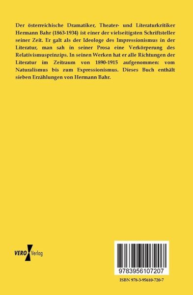 Der österreichische Dramatiker, Theater- und Literaturkritiker Hermann Bahr (1863-1934) ist einer der vielseitigsten Schriftsteller seiner Zeit. Er galt als der Ideologe des Impressionismus in der Literatur, man sah in seiner Prosa eine Verkörperung des Relativismusprinzips. In seinen Werken hat er alle Richtungen der Literatur im Zeitraum von 1890-1915 aufgenommen: vom Naturalismus bis zum Expressionismus. Dieses Buch enthält sieben Erzählungen von Hermann Bahr.