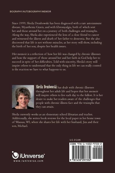 Since 1999, Sheila Dembowski has been diagnosed with a rare autoimmune disease, Myasthenia Gravis, and with fibromyalgia, both of which sent her and those around her on a journey of both challenges and truimphs. Along the way, Sheila also experienced the loss of a close friend to cancer and witnessed the illness and death of her father to dementia. But she also discovered that life is not without miracles, as her story will show, including the birth of her son, despite her health issues. Her memoir is a reflection of how her life was changed by chronic illnesses and how the support of those around her and her faith in God help her to succeed in spite of her difficulties. Told with sincerity, Sheila's story will inspire others to understand that the only thing in life we can really control is the reaction we have to what happens to us.