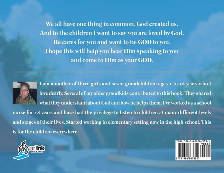 I am a mother of three girls and seven grandchildren ages 1 to 16 years who I love dearly. Several of my older grandkids contributed to this book. They shared what they understand about God and how he helps them. I've worked a s a school nurse for 18 years and have had the privilege to listen to children at many different levels and stages of their lives. Started working in elementary setting now in the high school. This is for the children everywhere.