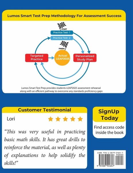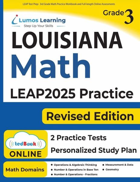 Louisiana Educational Assessment Program (LEAP) 3rd Grade Math Workbook for Kids (Ages 8-9) updated for 2025-26. Boost your child's LEAP test scores using the Lumos Grade 3 Math Test Prep Workbook. Crafted by expert educators, this workbook comprehensively covers over 30+ essential math skills tailored for third graders. Featuring a wide variety of standards-aligned practice questions, the Lumos LEAP workbook supports your child to enhance math proficiency through consistent daily and weekly practice, resulting in improved LEAP test scores. Why You'll Love This 3rd Grade Math Book for 2025-26 LEAP Test PrepExcel in 30+ Essential Math Skills: Master key math concepts including Operations & Algebraic Thinking, Number & Operations in Base Ten, Number & Operations - Fractions, Measurement and Data, Geometry. This comprehensive workbook fosters not just success in the Louisiana state assessment, but also cultivates a robust academic groundwork. Boost State Test Success: Lumos LEAP test prep workbooks break free from traditional print workbooks. It features a wide variety of standards-aligned content in both print and online formats. Lumos Smart Test Prep Methodology: Unlock success on the Louisiana state test (LEAP) powered by our proprietary Lumos Smart Test Prep Methodology. It provides simulated LEAP practice and remediation tools to overcome proficiency gaps. Replicated LEAP Practice: Access 2 full-length online practice tests mirroring the LEAP blueprint-question types, tech-enhanced items, duration, rigor of the standards, and more. Plus, the look and feel are the same as the actual LEAP computerized test, fostering comfort with the LEAP format, and boosting test readiness. Important Note: Once you register for the online program, the first practice test gets auto-assigned by Lumos Support.Personalized Study Plan for Targeted Remediation: Using your child's performance data from the online LEAP-like practice tests, the online program generates a personalized study plan. This plan includes a checklist of standards tailored to your child's needs, guiding them to improve with relevant practice questions from our workbook and online program. Track Your Child's Progress and Growth: Gain valuable insights with an intuitive dashboard in the online program to monitor advancement and pinpoint strong and weak areas. About Lumos Learning Lumos Learning has been a trusted partner in providing state test preparation resources to parents and educators for over 16 years. With an impressive reach of over 1 million students, 125,000 teachers, and 44,000 schools, our proven study programs improve student outcomes in state assessments. Versatile and Flexible Learning SolutionAt-Home Learning Classroom Learning Home Tutoring & Home Schooling. Resources in the Print Workbook5 chapters covering 30+ math skills Answer keys with detailed explanations Resources in the Online Program2 full-length practice tests mirroring the LEAP blueprint Personalized study plan for targeted remediation Supplementary resources: solved examples, videos, and more User-friendly dashboard and performance reports for progress measurement Access LEAP Online Resources in 3 Easy StepsScan the QR code or visit www.lumoslearning.com/a/tedbooks Enter the access code provided within the print workbook Provide basic details and get started!