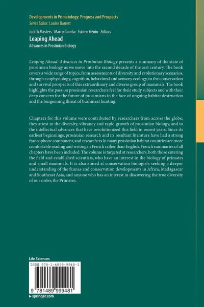 Leaping Ahead: Advances in Prosimian Biology presents a summary of the state of prosimian biology as we move into the second decade of the 21st century. The book covers a wide range of topics, from assessments of diversity and evolutionary scenarios, through ecophysiology, cognition, behavioral and sensory ecology, to the conservation and survival prospects of this extraordinary and diverse group of mammals. The collection was inspired by an international conference in Ithala, KwaZulu-Natal, South Africa in 2007, where prosimian biologists gathered from Canada, Finland, France, Germany, India, Italy, Japan, Madagascar, South Africa, Tanzania, the United Kingdom, and the United States of America. The meeting reverberated with the passion prosimian researchers feel for their study subjects and with their deep concern for the future of prosimians in the face of ongoing habitat destruction and the burgeoning threat of bushmeat hunting. Chapters for this volume were contributed by researchers from across the globe; they attest to the diversity, vibrancy and rapid growth of prosimian biology, and to the intellectual advances that have revolutionized this field in recent years. Since its earliest beginnings, prosimian research and its resultant literature have had a strong francophone component, and researchers in many prosimian habitat countries are more comfortable reading and writing in French rather than English. French summaries of all chapters have been included. The volume is targeted at researchers, both those entering the field and established scientists, who have an interest in the biology of primates and small mammals. It is also aimed at conservation biologists seeking a deeper understanding of the faunas and conservation developments in Africa, Madagascar and Southeast Asia, and anyone who has an interest in discovering the true diversity of our order, the Primates.