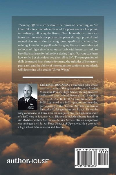 "Leaping Off" is a story about the rigors of becoming an Air Force pilot in a time when the need for pilots was at a low point, immediately following the Korean War. It entails the miniscule items used to wash out prospective pilots through physical and mental demands prior to being found qualified to enter pilot training. Once in the pipeline the fledgling fliers are now subjected to hours of flight time in various aircraft with instructors told to have little patience for infractions during flight. "Anyone can learn how to fly, but time does not allow all to fly". The progression of skills demanded is an obstacle for many, the attitudes of instructors pays a toll and the ability of the students to conform to standards will determine who attains "Silver Wings"